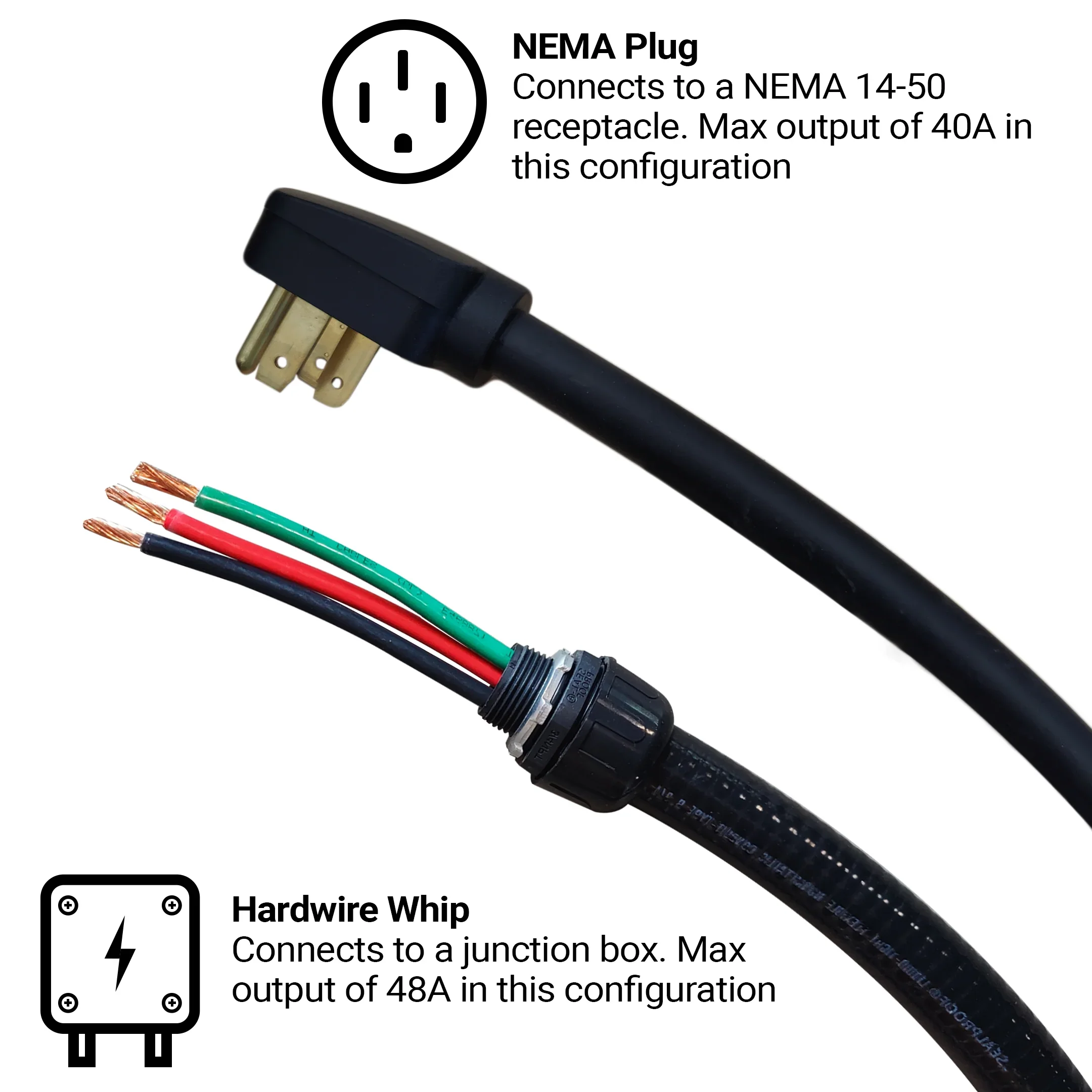 Max Power: 11.5kW (48A) hardwired / 9.6kW (40A) NEMA 14-50